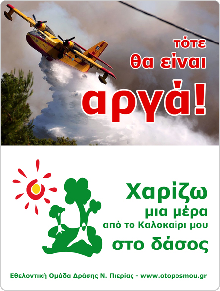 Απομένουν συνολικά ακόμη 31 κενές βάρδιες στα τρία παρατηρητήρια της Εθελοντικής Ομάδας Δράσης Ν. Πιερίας. Σας παρακαλούμε, αφού προωθήσετε το μήνυμα αυτό σε φίλους και γνωστούς και το αναρτήσετε στα κοινωνικά δίκτυα, να χαρίσετε κι εσείς με τη σειρά σας 5 ώρες από το καλοκαίρι σας στο δάσος: Δηλώστε συμμετοχή εδώ: Δηλώστε συμμετοχή εδώ Φίλες και φίλοι, Εδώ και 7 χρόνια, κάθε καλοκαίρι, συμπολίτες μας που εμπνέονται από την αγάπη για τη φύση, το περιβάλλον και την ανάγκη της προστασίας των δασών του νομού μας από πυρκαγιά, προσφέρουν εθελοντική φύλαξη επί 90 συνεχόμενες ημέρες (μέσα Ιουνίου έως μέσα Σεπτεμβρίου) κατά τις ώρες 10:00 – 20:00 που μοιράζεται σε δύο βάρδιες των 5 ωρών. Τα μέλη της Εθελοντικής Ομάδας Δράσης Ν. Πιερίας παρακολουθούν καθημερινά από τα τρία παρατηρητήρια (Ν. Πόροι, Πλάκα Λιτοχώρου, Έλαφος) την ευρύτερη περιοχή του Ολύμπου και των Πιερίων και σε περίπτωση ένδειξης φωτιάς οι εθελοντές επικοινωνούν άμεσα με την Πυροσβεστική Υπηρεσία στο τηλέφωνο 199, δηλώνοντας το όνομά τους, το ακριβές σημείο της φωτιάς και το τηλέφωνό τους. Κάθε χρόνο, δηλώνονται από τα παρατηρητήρια αυτά συνολικά 20 έως 30 περιστατικά φωτιάς, τα οποία χάρη στην έγκαιρη επέμβαση της Πυροσβεστικής Υπηρεσίας αντιμετωπίζονται επιτυχώς, πριν εξελιχτούν σε καταστροφικές πυρκαγιές. Έχοντας ως βασικό μήνυμα πως η πιο αποτελεσματική προστασία του δάσους είναι η πρόληψη, πιστεύουμε πως υπάρχει ρόλος, θέση και χώρος για όλους μας στη διαφύλαξη του δασικού μας πλούτου. Το φετινό καλοκαίρι δεν ήταν ιδιαίτερα ζεστό, όμως ο καιρός άλλαξε και ο βαθμός επικινδυνότητας δασικών πυρκαγιών έχει αυξηθεί δραματικά. Στόχος μας είναι, και φέτος, κανένα από τα παρατηρητήρια του νομού μας να μην μείνει κενό ούτε για μια στιγμή! Υπάρχει λοιπόν μεγάλη ανάγκη και γι αυτό σας καλούμε να στηρίξτε ΤΩΡΑ με την ενεργό συμμετοχή σας το «Χαρίζω μια μέρα από το Καλοκαίρι μου στο Δάσος 2014»! Την αγαπημένη δράση των Πιεριαίων η οποία τα τελευταία χρόνια έχει συμβάλλει τα μέγιστα στην ευαισθητοποίηση της τοπικής κοινωνίας και στην έγκαιρη αντιμετώπιση των πυρκαγιών στο νομό μας. Σας παρακαλούμε, αφού να προωθήσετε το μήνυμα αυτό σε φίλους και γνωστούς και το αναρτήσετε στα κοινωνικά δίκτυα, να χαρίσετε κι εσείς με τη σειρά σας 5 ώρες από το καλοκαίρι σας στο δάσος: Δηλώστε συμμετοχή εδώ: Δηλώστε συμμετοχή εδώ |